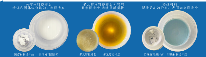 2.It can evenly stir a variety of materials in a short time, including high-viscosity materials, liquids, and even nanoscale powder materials, and can also stir materials with a large mixing ratio or specific gravity difference, and simultaneously stir and defoam treatment with super strength and high speed.